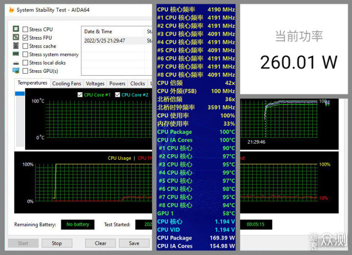 关闭AVX512,FPU在5分钟后,CPU的频率降到4.1~4.2GHz,8核心平均温度为95.6℃,AIDA64显示CPU功耗为~170w,小米智能插座显示整机输入功耗不到260w。