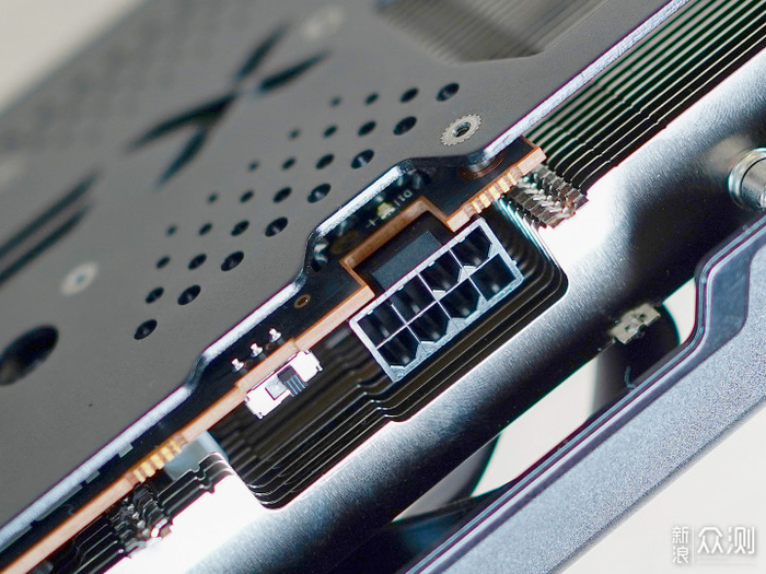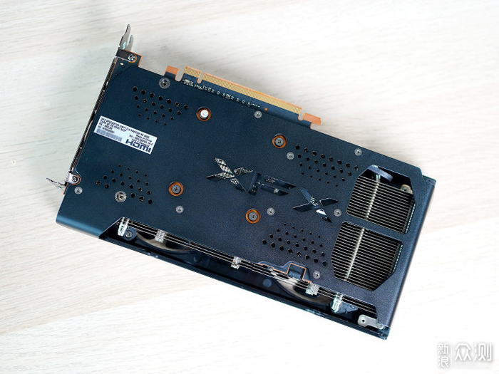 背面配备了金属背板,并有镂空的XFX logo和圆点作为装饰,前端是大面积的镂空,是贯穿鳍片的风道设计,也就是说PCB其实是短于散热器长度的。