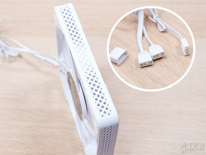 自带的风扇是一把15mm厚度的12cm薄扇,采用了FDB轴承,风扇转速700~1800,风量13.1~62CFM,静风压0.2~2.0mmH2O,噪音18.6~29.7dBA。该风扇有ARGB灯光,带有一公一母的3pin 5V接口,方便串联其它ARGB设备。
