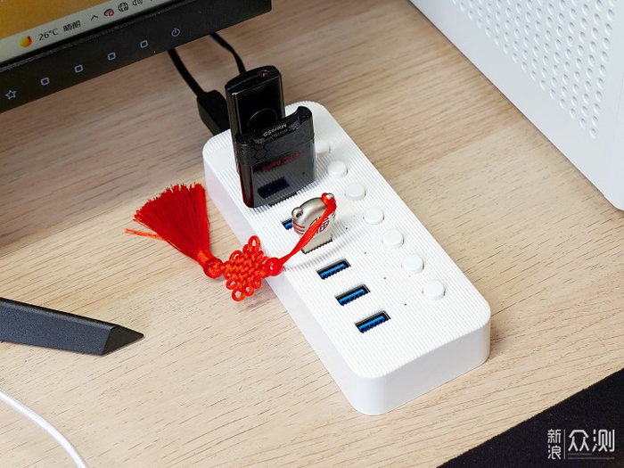 对了,还有一个问题,这款机箱为了追求完美的外观,没有提供任何的USB接口,虽然也可以直接开盖使用主板的IO接口,还是稍麻烦。我解决的办法是入手一个ORICO7口集线器(有独立的适配器供电)。