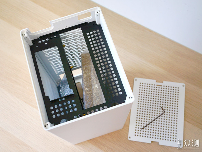打开顶盖后发现双侧版的固定方式为卯榫结构,抽拽可以滑出。
