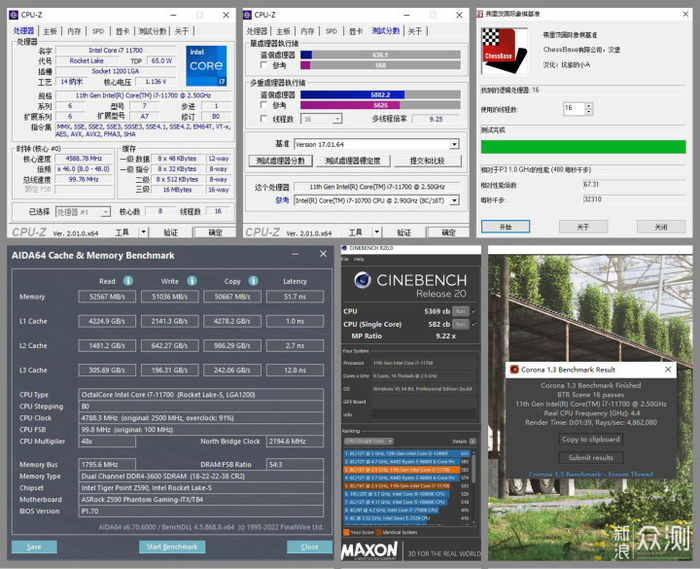 i7-11700处理器为8核心16线程设计,最高睿频4.9GHz(单核),全核频率为4.4GHz。作了些常规的CPU跑分测试,也能基本能发挥出i7的全部实力。NOX暗黑女神内存在Gear1模式下达到开启XMP后的3600MHz频率完全没有问题,读写速度和延迟都还不错。