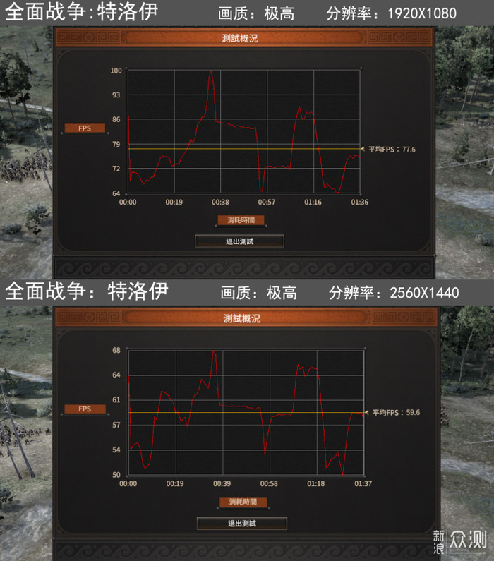 《全面战争:特洛伊》的Bench,极高(最高)画质下,1080p分辨率下达到78fps;提高到2k分辨率,帧数下降到接近60fps,对于一款RTS游戏也是足够了的。
