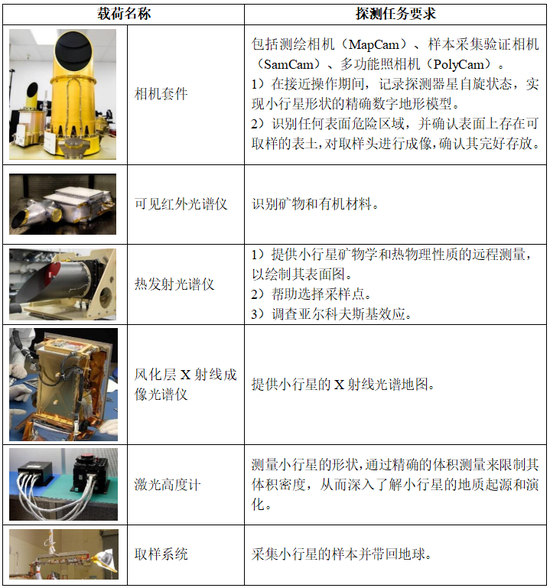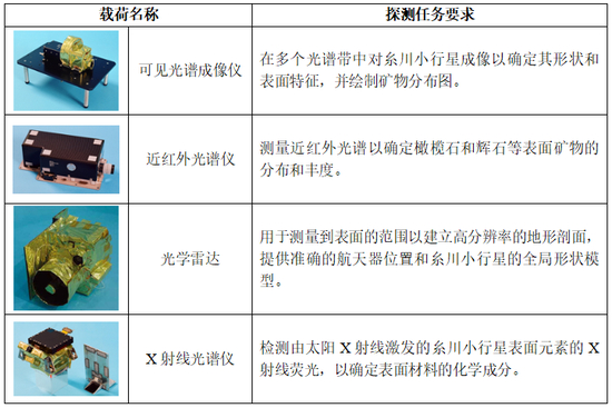 为了对小行星的自转参数、形状、地质形貌、表面组分、磁场环境等进行全面的探测,探测任务配置的科学载荷有中视场彩色相机、多光谱相机、热辐射光谱仪、可见红外成像光谱仪、探测雷达、磁强计、带电粒子与中性粒子分析仪、喷发物分析仪等。