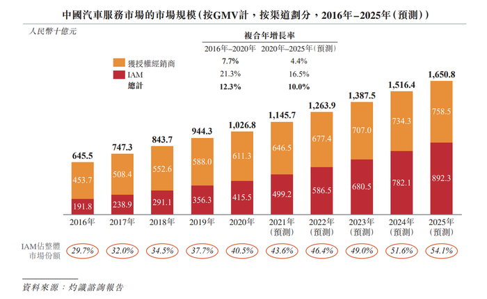 这进一步佐证了市场的复杂性。而这种复杂性,几乎是现有汽车服务市场从形成之初就自带的。但是,这广阔的第三方市场,数十万家门店,始终是一笔令人垂涎的财富。灼识咨询预计,中国汽车服务市场的GMV规模将在2025年达到16508亿元,其中超过一半,是留给IAM发挥的空间。