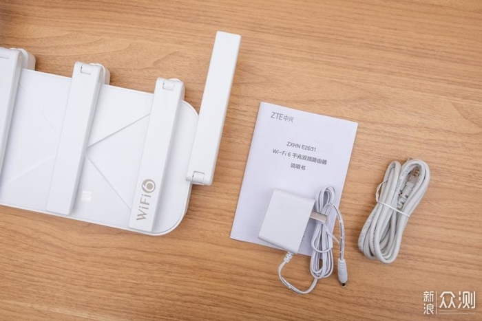 外包装就不多做介绍了,直接看看配件,除了中兴AX3000巡天版WiFi6路由器,还带有说明书、电源适配器和千兆网线,跟市面上路由器搭配大多相似。