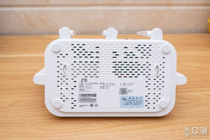 底部除了带有四个防滑脚垫和挂墙孔,还带有丰富的散热孔,可以保证长时间运行不会因为散热不良出现问题,据说中兴自主研发的这个芯片可以实现4万小时不间断稳定运行,由此可见有多稳定。
