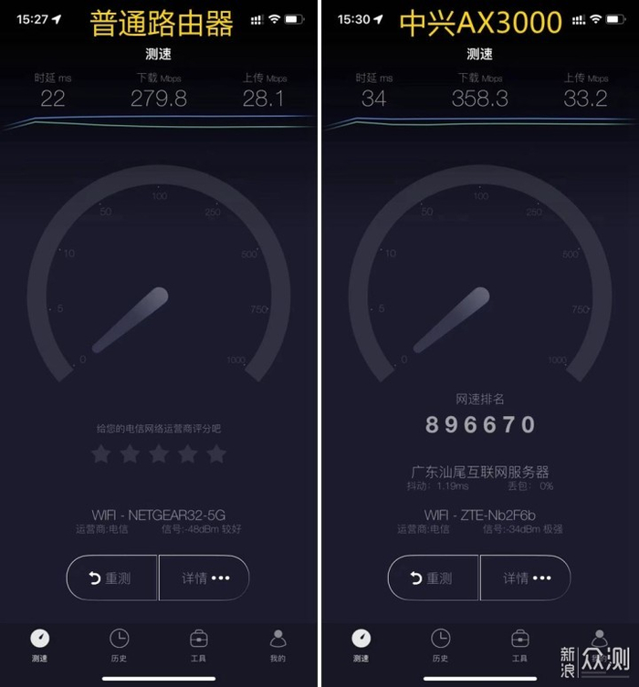 从以上的对比就可以看出明显的区别,普通路由器得到的下载速率为279.8Mbps,换了中兴AX3000巡天版WiFi6路由器之后,测试得到的结果为358.3Mbps,直接跑溢出了,这效果真不是盖的,跑不到速率真是路由器影响的,能达到这样的效果,太让我惊喜了。