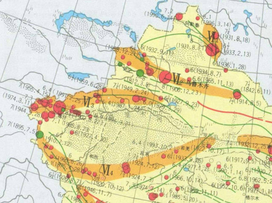 新疆境内的地震带与地震历史记录(截至1996年)。