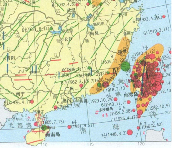 但东南沿海,存在一系列的活动断裂,发生过震级较大的地震,这可能和受到东部菲律宾板块的俯冲挤压有关。1605年在海南琼山,发生7.5级地震,致使沿海70多个村庄沉海,死亡数千人。1918年,在广东南澳近海,再次发生7.5级地震,造成了很大的破坏。福建海外也不安宁,1604年,泉州海外发生一次8级大地震,此后,还发生过多次较强地震。现在研究认为,在台湾海峡至海南岛的海域内,存在一条或若干条活动断裂,具有发生大地震的能力。
