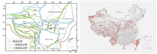 左图为中国的地块,橙线为板块边界,蓝线为一级地块的边缘,绿线为二级地块的边缘。右图为公元前2600年至公元2000年中国4级以上地震分布图。两图对比,可见地震多发地区与地块边缘重合度颇高。在这些地块边界上,发生了中国100%的8级以上大地震,这些边界占中国国土面积的16%。也就是说,中国16%面积的国土发生破坏性大地震的可能性远大于其他地区。