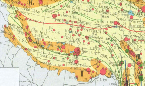 在青藏地块及其周边,发生过多次强震。最近的一次就是发生在2008年发生在龙门山地区的汶川地震,相信每个人对这次地震记忆犹新。而在1920年,在宁夏海原,发生了一次8.5级大地震,造成约29万人死亡。1950年,西藏墨脱发生了8.6级地震,造成1500多人死亡。2001年,在昆仑断裂上,发生一次8.1级地震,所幸当地是无人区,没有造成人员伤亡。而这一带小地震更多,比如2016年2月,新疆于田7.3级地震,就发生在阿尔金断裂的西端,2010年玉树地震发生在玉树-甘孜断裂上。另外,在高原东北缘的祁连山麓和河西走廊,人口稠密,历史上也曾发生多次大地震,比如1932年酒泉昌马7.6级地震,约7万人遇难,1927年武威古浪县,发生8级大地震,死亡4万多人。