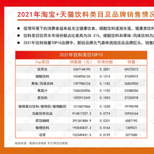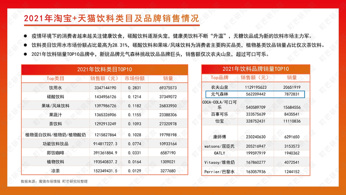 2021年淘宝饮料品牌销售榜单:元气森林整体排名首次超可口可乐