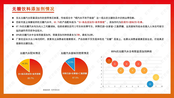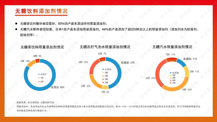 要想无糖饮料行业发展得更好、走得更远,需要不断树立行业标杆、明确标准规范。町芒研究院在《报告》中公布评测数据,明确指出无糖汽水的添加剂问题。