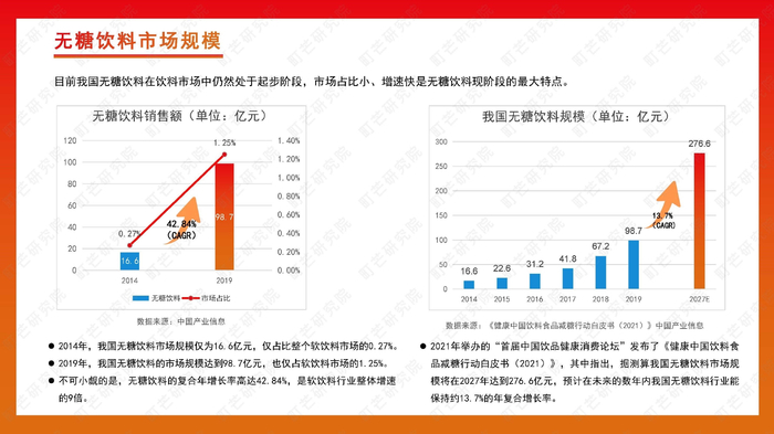 随着当今健康理念的流行,消费者更加注重无糖、减脂的饮料消费,无糖饮料也一跃成为饮料市场的“生力军”。自2014年至2019年,我国无糖饮料市场规模复合年增长率高达42.84%,是软饮料行业整体增速的9倍。《健康中国饮料食品减糖行动白皮书(2021)》就指出,据测算我国无糖饮料市场规模将在2027年达到276.6亿元。