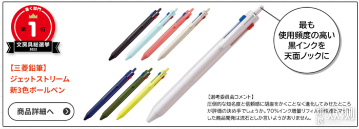 第一名来自三菱uni的多功能笔,整体去看,它只是基础的设计,黑、蓝、红三色配置,但在握持属性上,有低重心设计加上柔软的笔握,有比较好的使用舒适度。和一般多功能笔不同,它将蓝黑设计在了两侧,顶部做了黑色笔芯的专项按钮,作为一款黑笔使用会更方便。