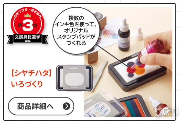 它提供了各种墨水和空白印台搭配,可以自由分配印台上的颜色,用雕刻印实现颜色变化的印章效果,是一款比较有趣的新颖印台。