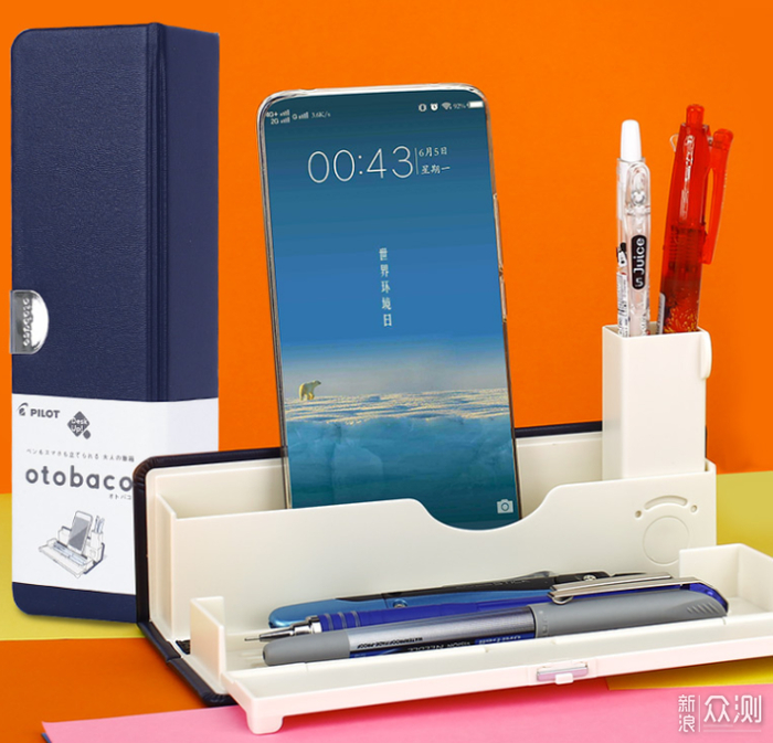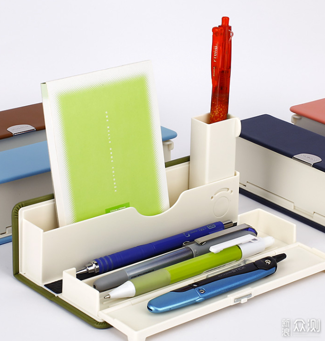 百乐这款笔盒还是非常有趣的,收纳状态下呈小巧的长方体,打开后会迅速展开,形成一个微型笔夹+笔筒的结构,平行面可以摆放笔具,垂直面可以立起一个小笔筒加一个大槽,放本子、手机都可以,非常精巧的结构设计,打开方式内置磁扣,手感也是相当出色!