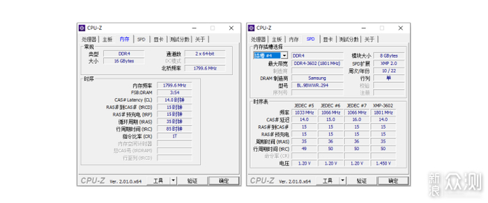 内存上机后一次点亮,在CPU-Z中确认宏碁掠夺者Vesta的规格为3600MHz频率,DRAM制造商为三星,支持XMP2.0一键超频,时序CL14-15-15-35。
