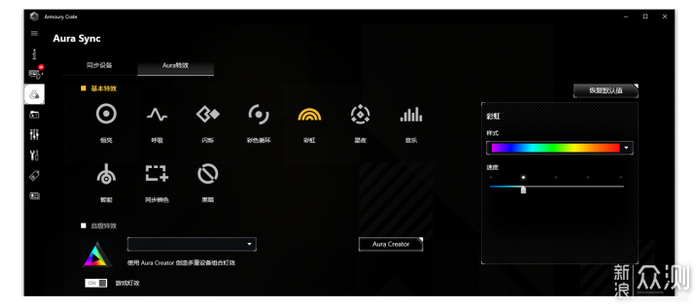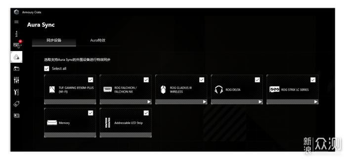进入到Armoury Crate奥创软件后,会在Aura Sync项中多出一个内存选择,表明宏碁掠夺者Vesta内存已被完美识别。随后将内存、主板、水冷、键盘和鼠标等各种设备一同勾选后,即可在Aura特效选项中进行同步样式调节、颜色设定、速度频率等等。