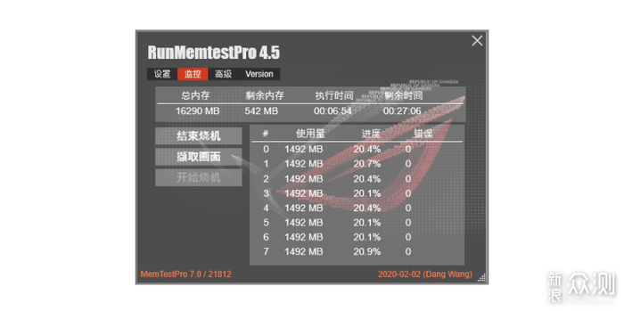 使用RunMemtest Pro烧机,宏碁掠夺者Vesta完美通过所有测试。其实在跑至20%时,没有跳错就基本不会有问题,一般不稳定都会在15%进度以前。