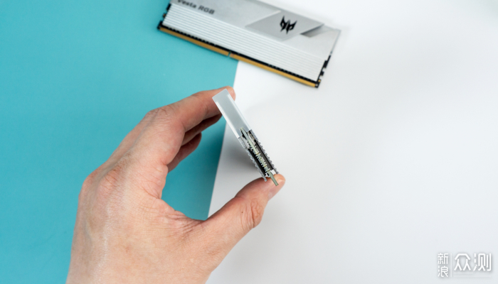 转到内存条侧面后,可看到铝制散热马甲、导热垫和内存颗粒这三者间的贴合十分紧密,并且散热马甲的厚度也不错,达到了1.2mm左右。