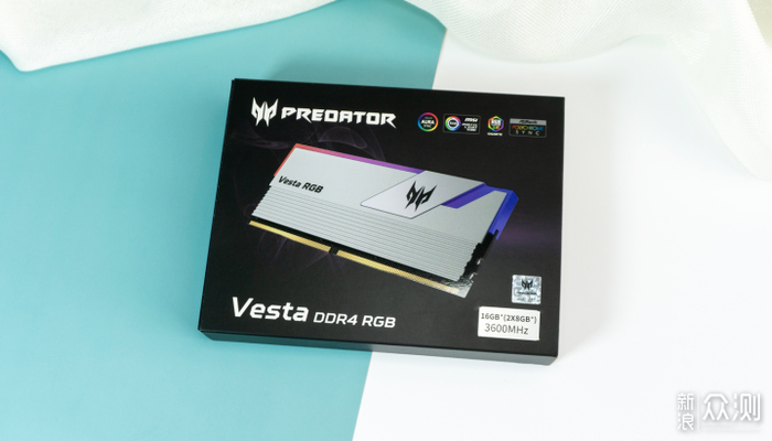 作为2x8GB的套装条来说,宏碁掠夺者(PREDATOR)RGB内存条的包装比装移动硬盘的盒子都要大,拥有着满满的分量感。值得一提的是,盒体的正面标注了4种RGB光效类型:华硕Aura Sync、微星MSI Mystic Light Sync、华擎Polychrome Sync和某嘉。