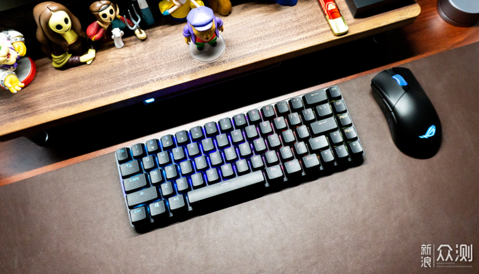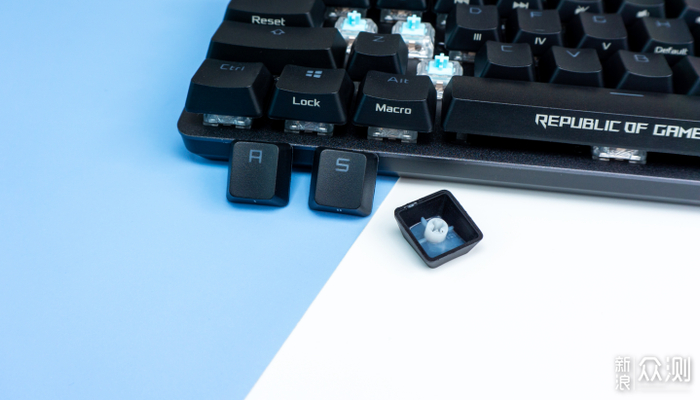 ROG魔导士NX键盘分为ROG自研和NX机械轴体。我手上这块为冰川蓝机械轴,触发键程2.3mm,触底键程4mm,触发压力65gf,回弹键程2.2mm,手感上介于黑轴与青轴之间。由于ROG魔导士NX采用无边框键帽悬浮式设计,所以日常打理也不必拔下键帽,只需要一把毛刷就能轻松处理键位间的污垢。