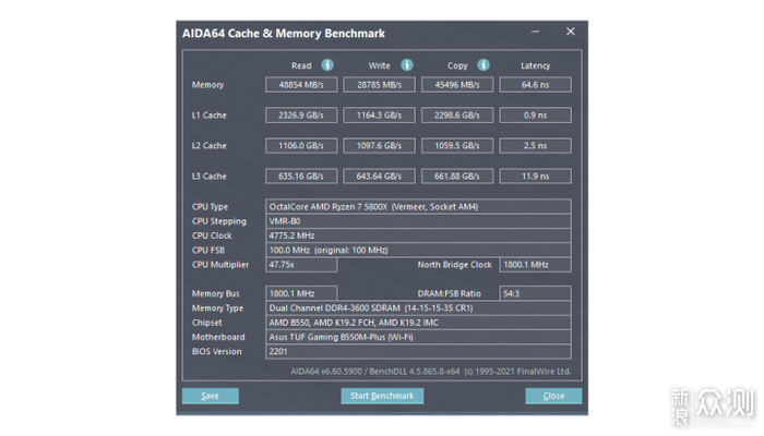 在AMD平台下,通过AIDA64测试,宏碁掠夺者Vesta内存在3600MHz下的读写速度为48G/28G/45G/ ,延迟值64.6ns,哪怕是3600MHz下的成绩就已经相当优秀了。可见时序与颗粒的差距真的很重要,甚至会影响到后续的超频性能。