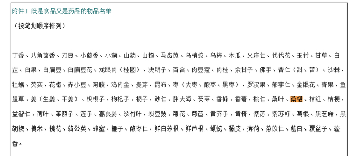 桑椹素有夏季“人参”之称,多成熟于5-6月。中医古籍《本草纲目》中曾论述到“椹有乌、白二种。单食,止消渴,利五脏关节,通血气。久服不饥,安魂镇神,令人聪明。”不仅如此,国家卫计委2002年发布文件《既是食品又是药品的物品名单》中还将桑椹赋予了保健功效。据2020版《中华人民共和国药典》记录,桑椹作为药材主要功效为“补血滋阴、生津润燥”,主要用于“津伤口渴,心悸失眠,须发早白。”