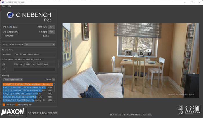 负载更高的CIENBENCH R23中,单核心1768pts、多核心16806pts、多核倍率9.51x,处理器性能释放表现出色。