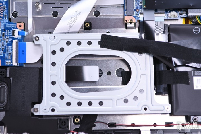 将机械革命旷世E游戏本D壳上所有的螺钉拧下,可见内部结构与高端的旷世如出一辙,做工非常规整,每一处宝贵的空间都得到了有效利用。D壳反面配有用于给固态硬盘散热的铝制散热片,并预留蓝色导热贴。