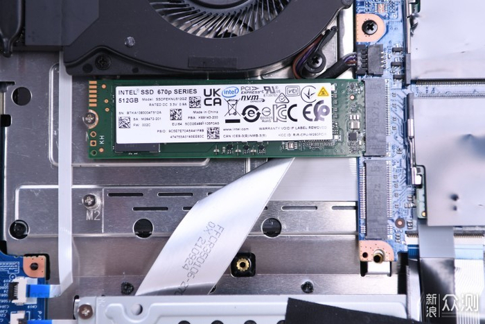 内存为两条来自镁光的DDR4-3200 8GB,组成了16GB双通道的规格。固态硬盘是Intel 670P,主流512GB容量。还提供1个闲置的M.2接口给用户自行扩展,值得注意的是这2个M.2接口均是PCI-E4.0 x4通道,自主升级配置不会影响到整机保修。