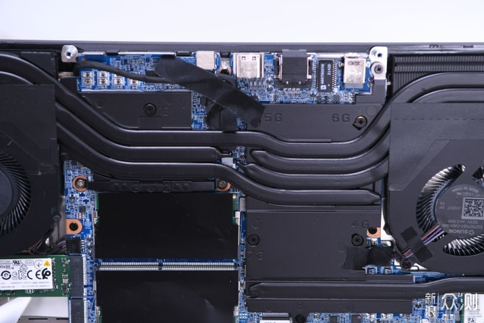为了压制满血版RTX 3070和i7 12700H的热量,散热模组规模达到7根热管,其中GPU与CPU共享2根、GPU独占2根、CPU独占1根、显存独占2根,双风扇四出风口的散热模组配合厚实且密集的鳍片带来出色的散热能力。
