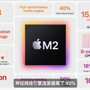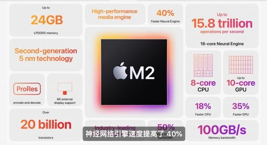 CPU和GPU之外,M2芯片还搭载了新一代神经网络引擎,虽然和M1一样同为16核,但是比M1芯片的速度快了40%。