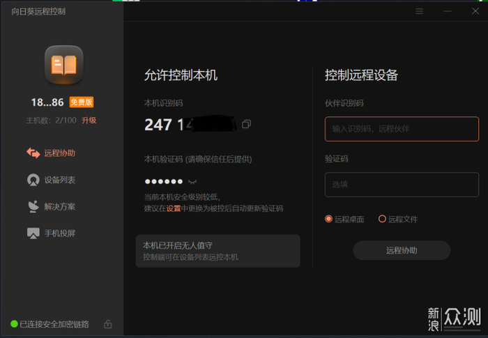 3、设置远程控制:在办公室台式电脑上的向日葵客户端上,进入远程协助菜单,可以看到本机识别码和本机验证码。