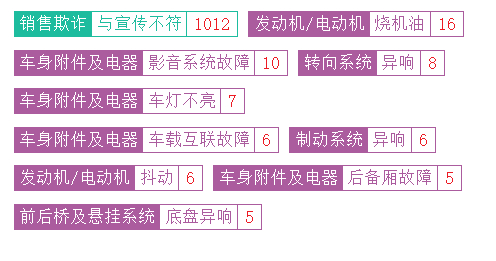 单单销售欺诈的问题就已经多达1012个,这样的数据甚至让消费者不可置信!同时它还面临着发动机烧机油,车身附件及电器影音系统故障,转向系统异响,车身附件及电器车灯不亮,车身附件及电器车载互联故障,制动系统异响,发动机抖动,车身附件及电器后备厢故障和前后桥及悬挂系统底盘异响等问题。这些问题每时每刻都在困扰着车主,让车主心寒!
