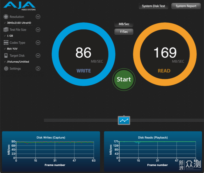 首先是在 M1 Mac 上,使用 AJA Video System,读取速度169MB/s、写入速度86MB/s。写入方面相比 V30 的规格要高上不少,读取部分也达到了标称值,写入和读取曲线也比较平顺。