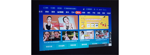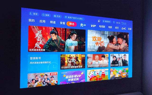 优派Q20投影仪搭载的是基于安卓深度定制的腾讯极光TV系统,从开机到进入主界面,全程无任何广告。正式进入系统后,可以看到系统UI采用了常见的选项卡式布局。从左至右大概有30多个项目,内容资源从电影、综艺、动漫、美食、运动、游戏、电竞等各种内容一应俱全。