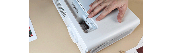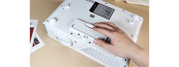 优派Q20在内部采用了密封光机技术,灰尘这块是无需担心的,但为了进一步杜绝灰尘,在顶部还设计了隐藏式面盖,推开后方可看到按键和镜头调节区。设计虽简,但却很实用。