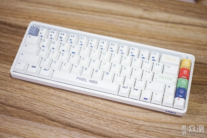 现在小尺寸键盘真的越来越火了,那这款米物像素PIXEL1985我认为就是一款性价比不错的小键盘,首先这款键盘采用了三模连接,再加上小尺寸让其便于携带,另外这款键盘的颜值非常出色,彩色的多功能按键搭配上白蓝的像素风,确实给人以既清新又俏皮的感觉。轴体方面键盘采用了佳达隆G黄pro,玩过键盘的朋友都知道这款轴体无论顺滑度还是稳定性上都表现不俗。