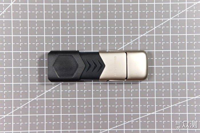 移速双接口固态U盘采用双隐藏式接口的设计,黑色和淡香槟金的撞色,配搭有点跑车造型的外观,看着有点特别,但整体印象依旧跟常规U盘没什么差异。