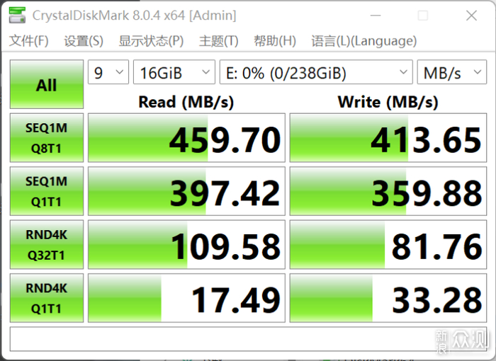接着用【CrystalDiskMark】来进行一轮热身跑分。可以看到连续读取速度最高可以达到459.7MB/s,已经接近厂家宣称的500MB/s的水平。写入速度稍稍低一些,但也达到了413.65MB/s,可以说也是相当快了。要注意我这里用的直接就是16GB文件大小,会比一般的4GB以下测试更严苛一些。