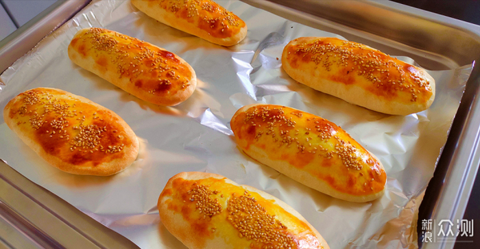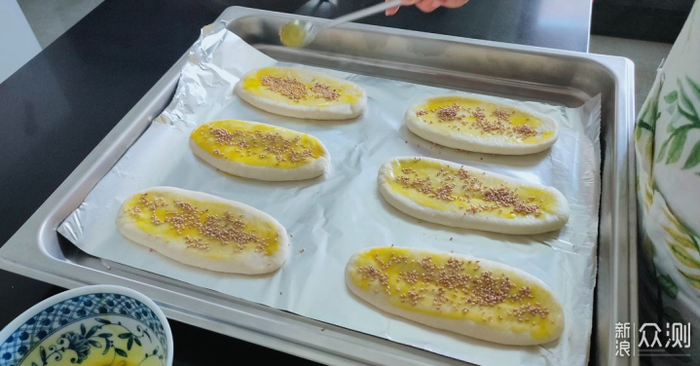 步骤⑤:取出面团分成6份,擀成小饼,包入糖心一下,外观像一个大饺子,然后把“饺子”轻轻按平,反正面擀成鞋底的样子,然后放烤盘的锡箔纸上,刷上蜂蜜水,撒上芝麻,就可以放进烤箱了;