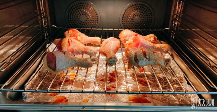 步骤②:在烤箱底部放置接油锡纸,然后中间部位放置烤网,切记烤网上不要放锡纸,直接放入鸡腿,把鸡腿放上去上下200度+3D热风循环,烤30分钟。不用翻面,最后5分钟上层火调到230分钟,出脆皮即可手工。