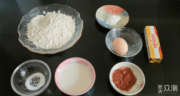 食材:低筋面粉200克(日清紫罗兰),泡打粉5克,盐2克,细砂糖50克,可可粉40g,总统牌黄油(冷冻)50克,牛奶(凉)90克,鸡蛋液(凉)30克。