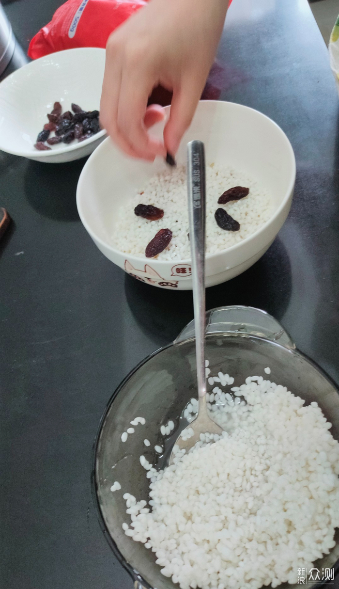 食材:糯米一碗,红枣6粒 ,葡萄干20g ,红糖30g。