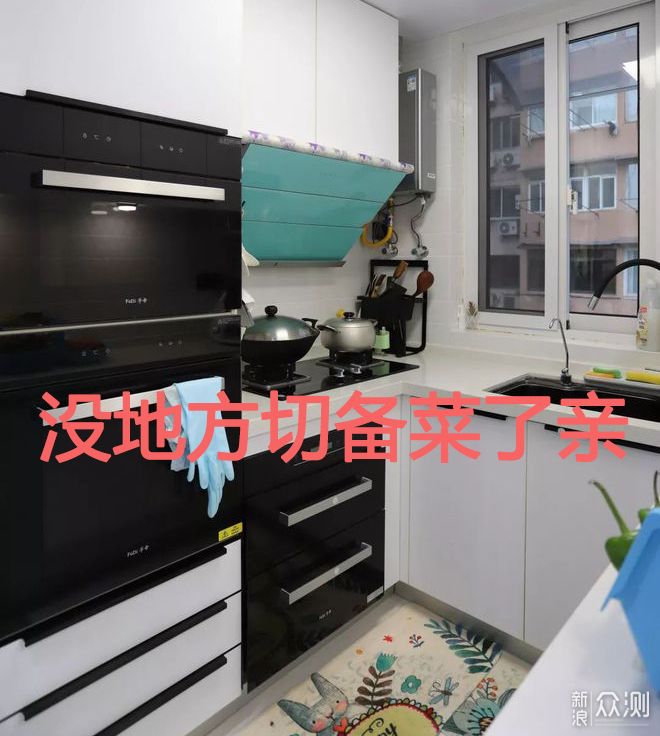 从图中我们可以看出,对于普通家庭来讲厨房放两个大机器,基本是不现实的。右侧的高柜如果横着放蒸箱烤箱,那么切菜炒菜的区域就会被缩减的很厉害,黄金的区域被占据;如果高柜上下放蒸烤箱,那么厨房杂七杂八的物品,没有地方放,尤其是做烘焙所需的物品真是特别的多。