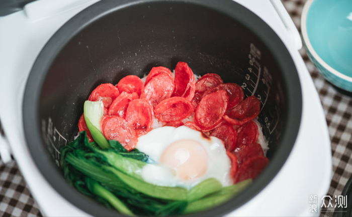 在米饭快煮好之前,放入切好片的广式腊肠肠和焯水的油菜。