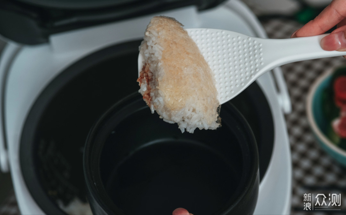米饭出炉后,记得用饭勺翻一下,这样的米饭吃起来更松软。能够看到米饭一点不粘锅。不糊底。